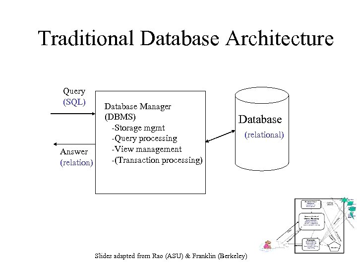 Traditional Database Architecture Query (SQL) Answer (relation) Database Manager (DBMS) -Storage mgmt -Query processing -View management -(Transaction processing) Database (relational) Slides adapted from Rao (ASU) & Franklin (Berkeley)