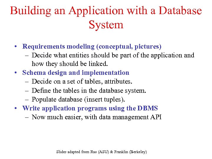 Building an Application with a Database System • Requirements modeling (conceptual, pictures) – Decide what entities should be part of the application and how they should be linked. • Schema design and implementation – Decide on a set of tables, attributes. – Define the tables in the database system. – Populate database (insert tuples). • Write application programs using the DBMS – Now much easier, with data management API Slides adapted from Rao (ASU) & Franklin (Berkeley)