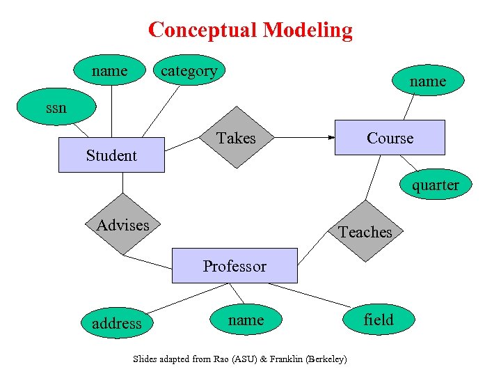 Conceptual Modeling name category name ssn Student Course Takes quarter Advises Teaches Professor address name Slides adapted from Rao (ASU) & Franklin (Berkeley) field