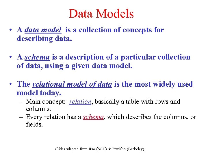 Data Models • A data model is a collection of concepts for describing data. • A schema is a description of a particular collection of data, using a given data model. • The relational model of data is the most widely used model today. – Main concept: relation, basically a table with rows and columns. – Every relation has a schema, which describes the columns, or fields. Slides adapted from Rao (ASU) & Franklin (Berkeley)