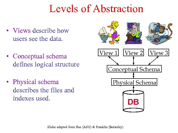 Levels of Abstraction • Views describe how users see the data. • Conceptual schema defines logical structure • Physical schema describes the files and indexes used. View 1 View 2 View 3 Conceptual Schema Physical Schema Slides adapted from Rao (ASU) & Franklin (Berkeley) DB