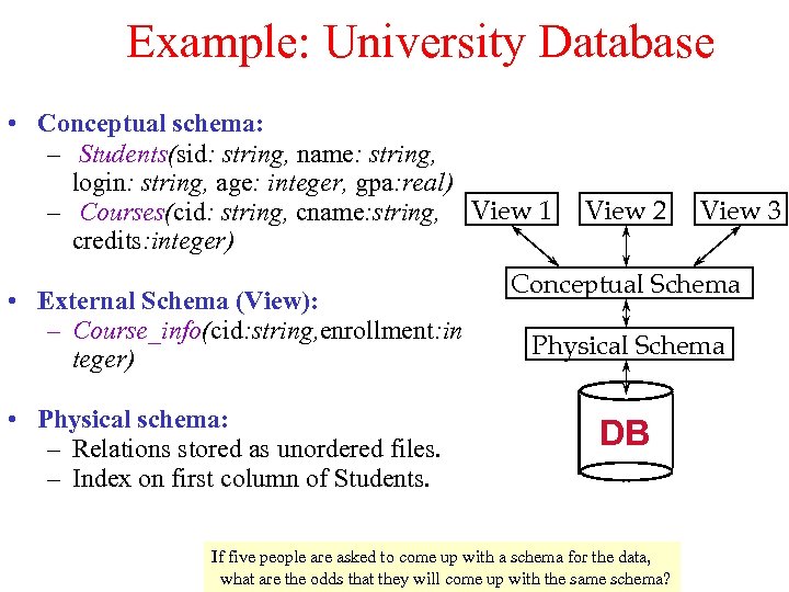 Example: University Database • Conceptual schema: – Students(sid: string, name: string, login: string, age: integer, gpa: real) – Courses(cid: string, cname: string, View 1 credits: integer) • External Schema (View): – Course_info(cid: string, enrollment: in teger) • Physical schema: – Relations stored as unordered files. – Index on first column of Students. View 2 View 3 Conceptual Schema Physical Schema DB If five people are asked to come up with a schema Slides adapted from Rao (ASU) & Franklin (Berkeley) for the data, what are the odds that they will come up with the same schema?