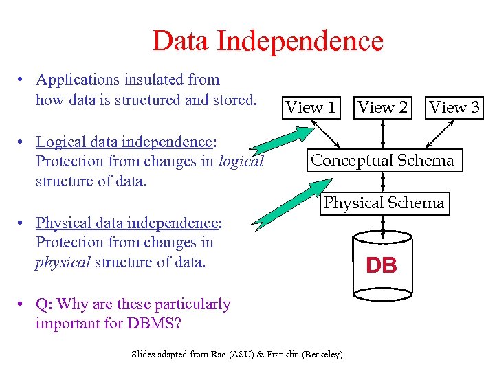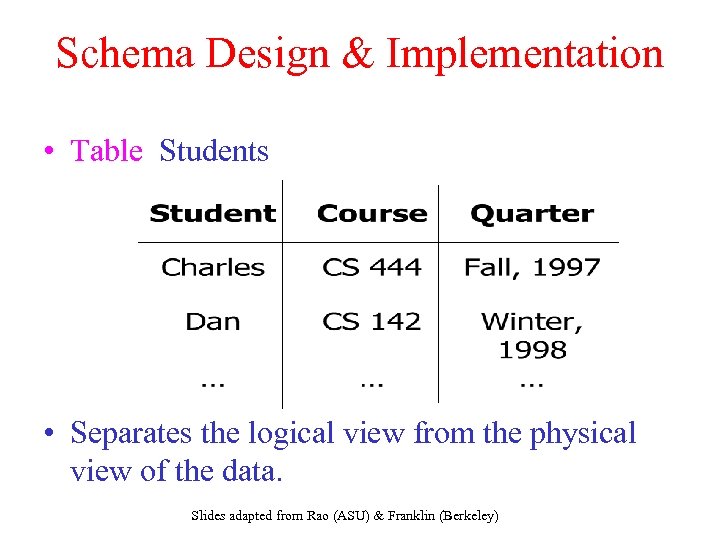 Schema Design & Implementation • Table Students • Separates the logical view from the physical view of the data. Slides adapted from Rao (ASU) & Franklin (Berkeley)