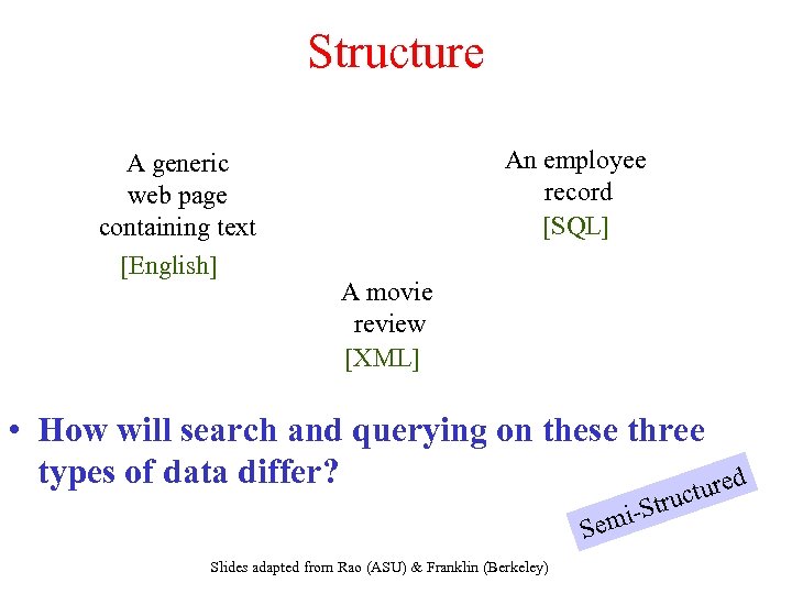 Structure A generic web page containing text [English] An employee record [SQL] A movie review [XML] • How will search and querying on these three types of data differ? d ture c -Stru mi Se Slides adapted from Rao (ASU) & Franklin (Berkeley)