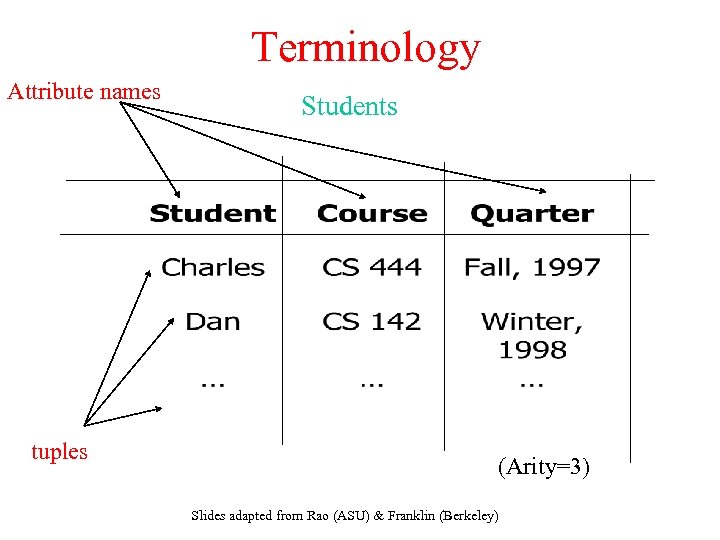 Terminology Attribute names tuples Students (Arity=3) Slides adapted from Rao (ASU) & Franklin (Berkeley)