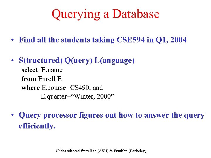 Querying a Database • Find all the students taking CSE 594 in Q 1, 2004 • S(tructured) Q(uery) L(anguage) select E. name from Enroll E where E. course=CS 490 i and E. quarter=“Winter, 2000” • Query processor figures out how to answer the query efficiently. Slides adapted from Rao (ASU) & Franklin (Berkeley)