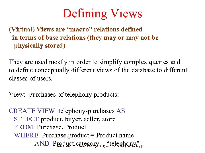 Defining Views (Virtual) Views are “macro” relations defined in terms of base relations (they may or may not be physically stored) They are used mostly in order to simplify complex queries and to define conceptually different views of the database to different classes of users. View: purchases of telephony products: CREATE VIEW telephony-purchases AS SELECT product, buyer, seller, store FROM Purchase, Product WHERE Purchase. product = Product. name AND Product. category = & Franklin (Berkeley) Slides adapted from Rao (ASU) “telephony”