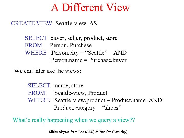A Different View CREATE VIEW Seattle-view AS SELECT buyer, seller, product, store FROM Person, Purchase WHERE Person. city = “Seattle” AND Person. name = Purchase. buyer We can later use the views: SELECT name, store FROM Seattle-view, Product WHERE Seattle-view. product = Product. name AND Product. category = “shoes” What’s really happening when we query a view? ? Slides adapted from Rao (ASU) & Franklin (Berkeley)
