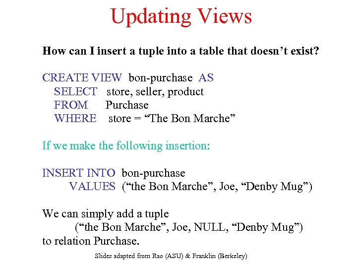 Updating Views How can I insert a tuple into a table that doesn’t exist? CREATE VIEW bon-purchase AS SELECT store, seller, product FROM Purchase WHERE store = “The Bon Marche” If we make the following insertion: INSERT INTO bon-purchase VALUES (“the Bon Marche”, Joe, “Denby Mug”) We can simply add a tuple (“the Bon Marche”, Joe, NULL, “Denby Mug”) to relation Purchase. Slides adapted from Rao (ASU) & Franklin (Berkeley)