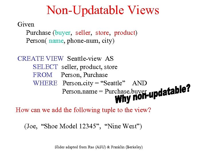 Non-Updatable Views Given Purchase (buyer, seller, store, product) Person( name, phone-num, city) CREATE VIEW Seattle-view AS SELECT seller, product, store FROM Person, Purchase WHERE Person. city = “Seattle” AND Person. name = Purchase. buyer How can we add the following tuple to the view? (Joe, “Shoe Model 12345”, “Nine West”) Slides adapted from Rao (ASU) & Franklin (Berkeley)