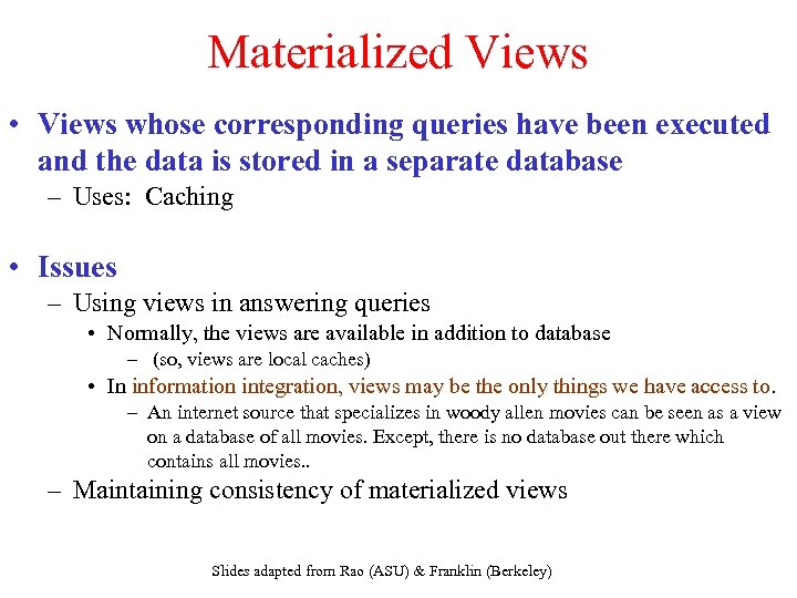 Materialized Views • Views whose corresponding queries have been executed and the data is stored in a separate database – Uses: Caching • Issues – Using views in answering queries • Normally, the views are available in addition to database – (so, views are local caches) • In information integration, views may be the only things we have access to. – An internet source that specializes in woody allen movies can be seen as a view on a database of all movies. Except, there is no database out there which contains all movies. . – Maintaining consistency of materialized views Slides adapted from Rao (ASU) & Franklin (Berkeley)