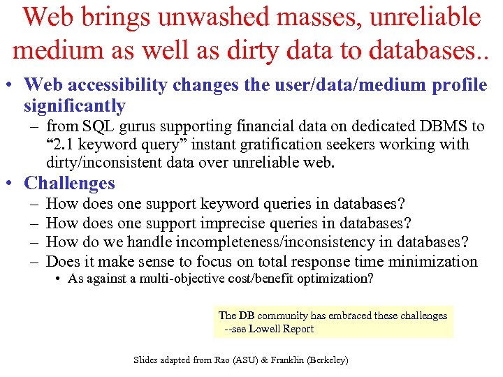 Web brings unwashed masses, unreliable medium as well as dirty data to databases. . • Web accessibility changes the user/data/medium profile significantly – from SQL gurus supporting financial data on dedicated DBMS to “ 2. 1 keyword query” instant gratification seekers working with dirty/inconsistent data over unreliable web. • Challenges – – How does one support keyword queries in databases? How does one support imprecise queries in databases? How do we handle incompleteness/inconsistency in databases? Does it make sense to focus on total response time minimization • As against a multi-objective cost/benefit optimization? The DB community has embraced these challenges --see Lowell Report Slides adapted from Rao (ASU) & Franklin (Berkeley)
