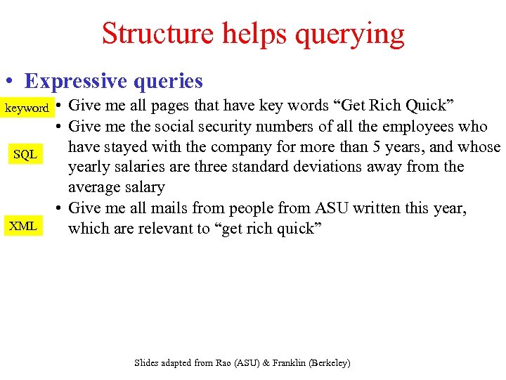 Structure helps querying • Expressive queries keyword SQL XML • Give me all pages that have key words “Get Rich Quick” • Give me the social security numbers of all the employees who have stayed with the company for more than 5 years, and whose yearly salaries are three standard deviations away from the average salary • Give me all mails from people from ASU written this year, which are relevant to “get rich quick” Slides adapted from Rao (ASU) & Franklin (Berkeley)