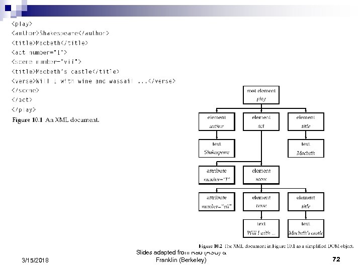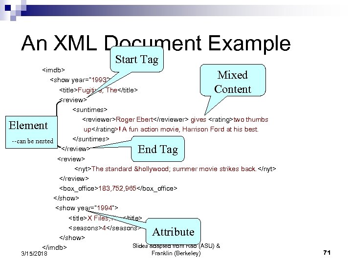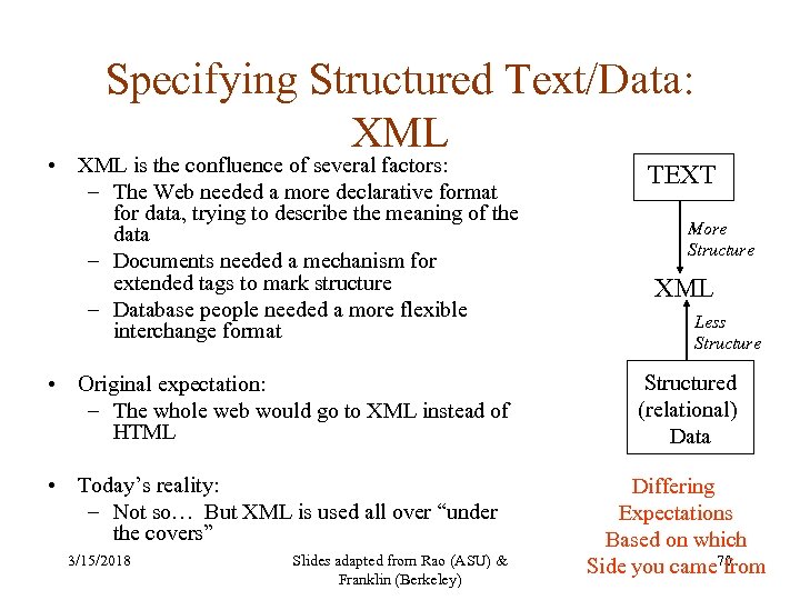 Specifying Structured Text/Data: XML • XML is the confluence of several factors: – The Web needed a more declarative format for data, trying to describe the meaning of the data – Documents needed a mechanism for extended tags to mark structure – Database people needed a more flexible interchange format TEXT • Original expectation: – The whole web would go to XML instead of HTML Structured (relational) Data • Today’s reality: – Not so… But XML is used all over “under the covers” 3/15/2018 Slides adapted from Rao (ASU) & Franklin (Berkeley) More Structure XML Less Structure Differing Expectations Based on which Side you came 70 from