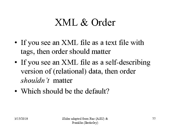 XML & Order • If you see an XML file as a text file with tags, then order should matter • If you see an XML file as a self-describing version of (relational) data, then order shouldn’t matter • Which should be the default? 3/15/2018 Slides adapted from Rao (ASU) & Franklin (Berkeley) 77