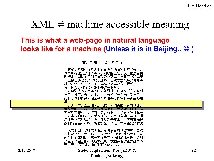 Jim Hendler XML machine accessible meaning This is what a web-page in natural language looks like for a machine (Unless it is in Beijing. . ) 3/15/2018 Slides adapted from Rao (ASU) & Franklin (Berkeley) 82