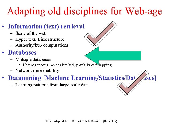 Adapting old disciplines for Web-age • Information (text) retrieval – Scale of the web – Hyper text/ Link structure – Authority/hub computations • Databases – Multiple databases • Heterogeneous, access limited, partially overlapping – Network (un)reliability • Datamining [Machine Learning/Statistics/Databases] – Learning patterns from large scale data Slides adapted from Rao (ASU) & Franklin (Berkeley)