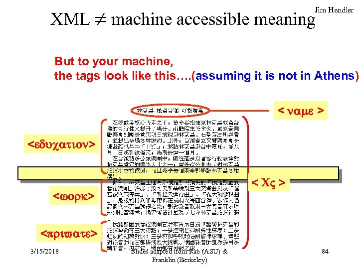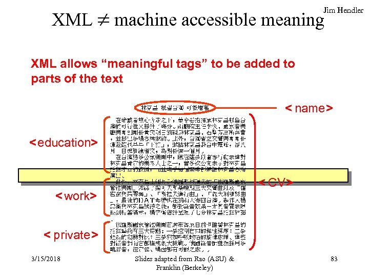 XML machine accessible meaning Jim Hendler XML allows “meaningful tags” to be added to parts of the text < name > < education> < CV > < work> < private > 3/15/2018 Slides adapted from Rao (ASU) & Franklin (Berkeley) 83