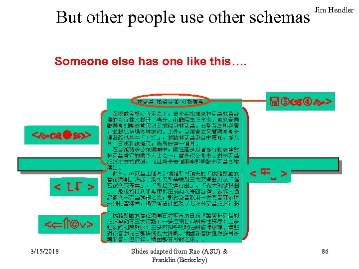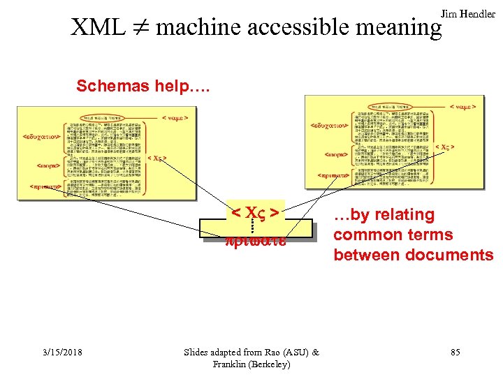 XML machine accessible meaning Jim Hendler Schemas help…. < CV > private 3/15/2018 Slides adapted from Rao (ASU) & Franklin (Berkeley) …by relating common terms between documents 85