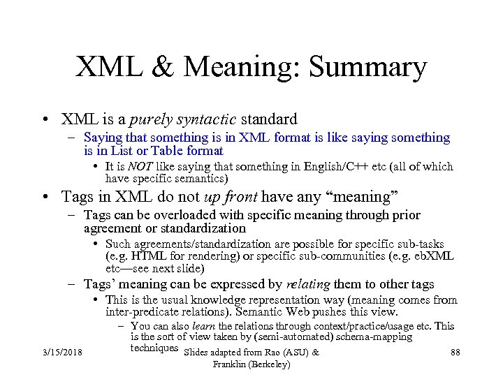 XML & Meaning: Summary • XML is a purely syntactic standard – Saying that something is in XML format is like saying something is in List or Table format • It is NOT like saying that something in English/C++ etc (all of which have specific semantics) • Tags in XML do not up front have any “meaning” – Tags can be overloaded with specific meaning through prior agreement or standardization • Such agreements/standardization are possible for specific sub-tasks (e. g. HTML for rendering) or specific sub-communities (e. g. eb. XML etc—see next slide) – Tags’ meaning can be expressed by relating them to other tags • This is the usual knowledge representation way (meaning comes from inter-predicate relations). Semantic Web pushes this view. 3/15/2018 – You can also learn the relations through context/practice/usage etc. This is the sort of view taken by (semi-automated) schema-mapping techniques Slides adapted from Rao (ASU) & 88 Franklin (Berkeley)