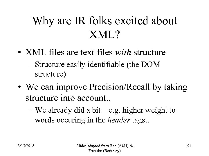 Why are IR folks excited about XML? • XML files are text files with structure – Structure easily identifiable (the DOM structure) • We can improve Precision/Recall by taking structure into account. . – We already did a bit—e. g. higher weight to words occuring in the header tags. . 3/15/2018 Slides adapted from Rao (ASU) & Franklin (Berkeley) 91