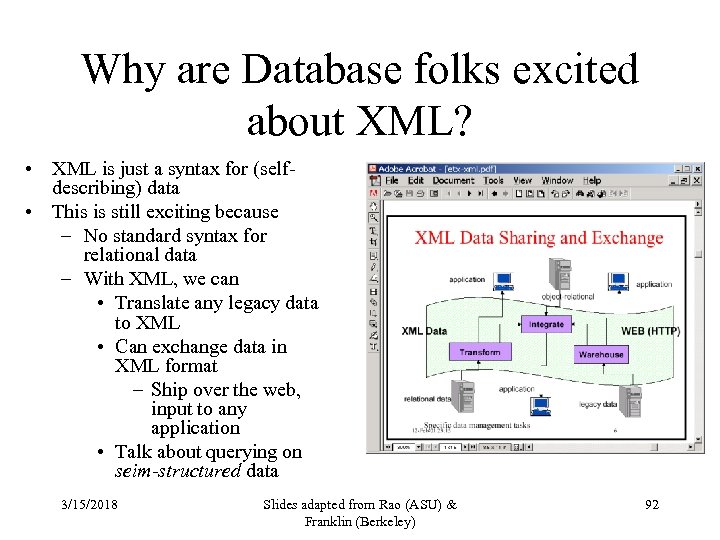 Why are Database folks excited about XML? • XML is just a syntax for (selfdescribing) data • This is still exciting because – No standard syntax for relational data – With XML, we can • Translate any legacy data to XML • Can exchange data in XML format – Ship over the web, input to any application • Talk about querying on seim-structured data 3/15/2018 Slides adapted from Rao (ASU) & Franklin (Berkeley) 92