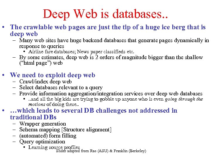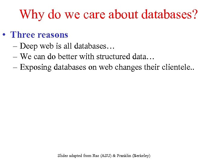 Why do we care about databases? • Three reasons – Deep web is all databases… – We can do better with structured data… – Exposing databases on web changes their clientele. . Slides adapted from Rao (ASU) & Franklin (Berkeley)