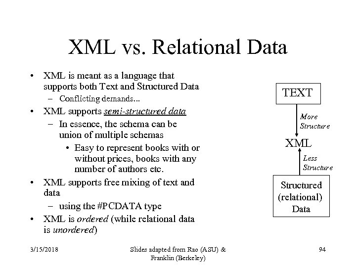 XML vs. Relational Data • XML is meant as a language that supports both Text and Structured Data – Conflicting demands. . . • XML supports semi-structured data – In essence, the schema can be union of multiple schemas • Easy to represent books with or without prices, books with any number of authors etc. • XML supports free mixing of text and data – using the #PCDATA type • XML is ordered (while relational data is unordered) 3/15/2018 Slides adapted from Rao (ASU) & Franklin (Berkeley) TEXT More Structure XML Less Structured (relational) Data 94