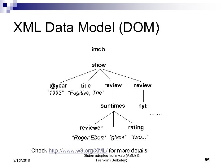 XML Data Model (DOM) imdb show review title @year “ 1993” “Fugitive, The” suntimes review nyt …… reviewer rating “Roger Ebert” “gives” “two. . . ” Check http: //www. w 3. org/XML/ for more details 3/15/2018 Slides adapted from Rao (ASU) & Franklin (Berkeley) 95