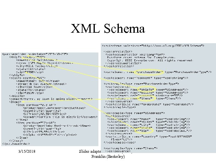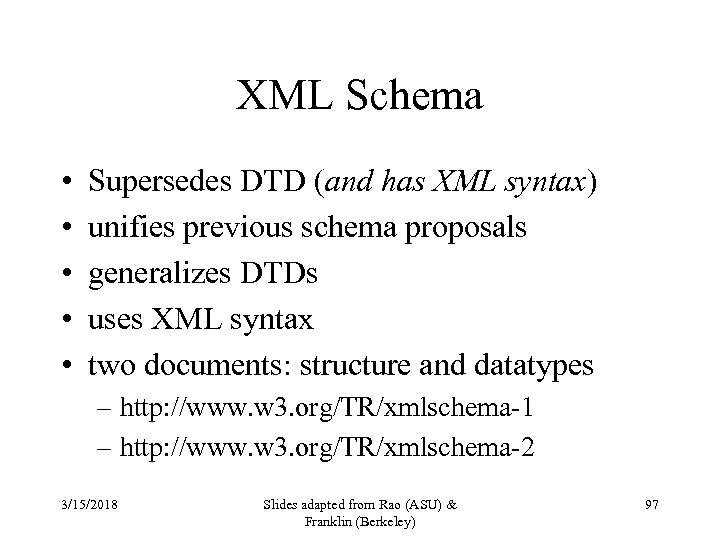 XML Schema 3/15/2018 Slides adapted from Rao (ASU) & Franklin (Berkeley) 98