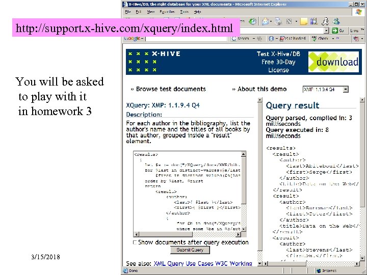 http: //support. x-hive. com/xquery/index. html You will be asked to play with it in homework 3 3/15/2018 Slides adapted from Rao (ASU) & Franklin (Berkeley) 101