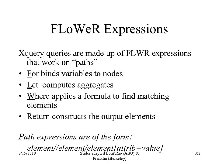 FLo. We. R Expressions Xquery queries are made up of FLWR expressions that work on “paths” • For binds variables to nodes • Let computes aggregates • Where applies a formula to find matching elements • Return constructs the output elements Path expressions are of the form: element//element[attrib=value] 3/15/2018 Slides adapted from Rao (ASU) & Franklin (Berkeley) 102