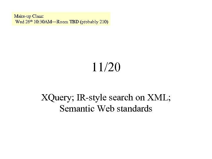 Make-up Class: Wed 26 th 10: 30 AM—Room TBD (probably 210) 11/20 XQuery; IR-style search on XML; Semantic Web standards