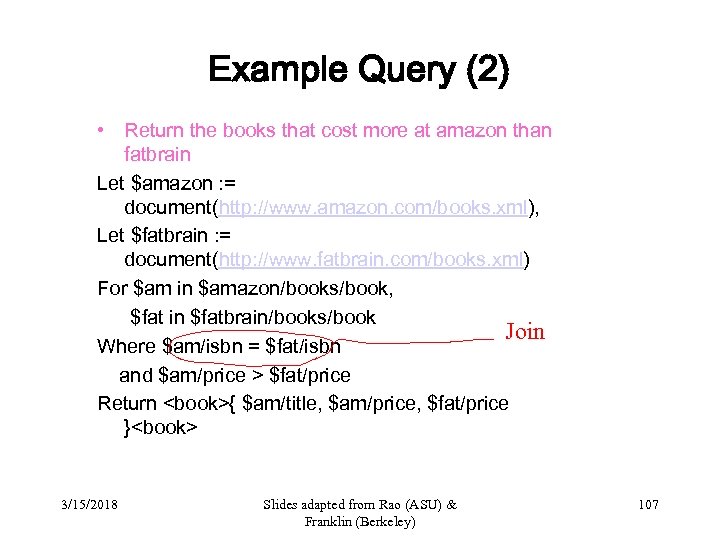 Example Query (2) • Return the books that cost more at amazon than fatbrain Let $amazon : = document(http: //www. amazon. com/books. xml), Let $fatbrain : = document(http: //www. fatbrain. com/books. xml) For $am in $amazon/books/book, $fat in $fatbrain/books/book Join Where $am/isbn = $fat/isbn and $am/price > $fat/price Return