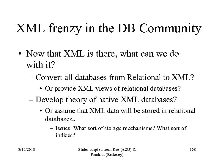 XML frenzy in the DB Community • Now that XML is there, what can we do with it? – Convert all databases from Relational to XML? • Or provide XML views of relational databases? – Develop theory of native XML databases? • Or assume that XML data will be stored in relational databases. . – Issues: What sort of storage mechanisms? What sort of indices? 3/15/2018 Slides adapted from Rao (ASU) & Franklin (Berkeley) 108