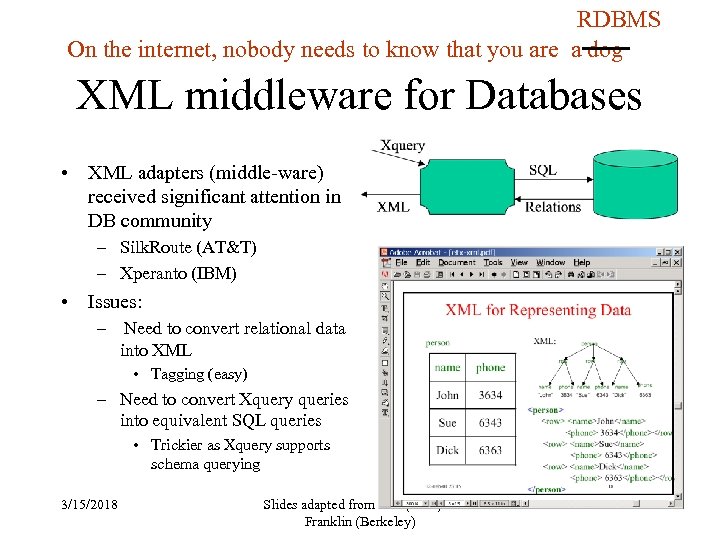 RDBMS On the internet, nobody needs to know that you are a dog XML middleware for Databases • XML adapters (middle-ware) received significant attention in DB community – Silk. Route (AT&T) – Xperanto (IBM) • Issues: – Need to convert relational data into XML • Tagging (easy) – Need to convert Xquery queries into equivalent SQL queries • Trickier as Xquery supports schema querying 3/15/2018 Slides adapted from Rao (ASU) & Franklin (Berkeley) 109