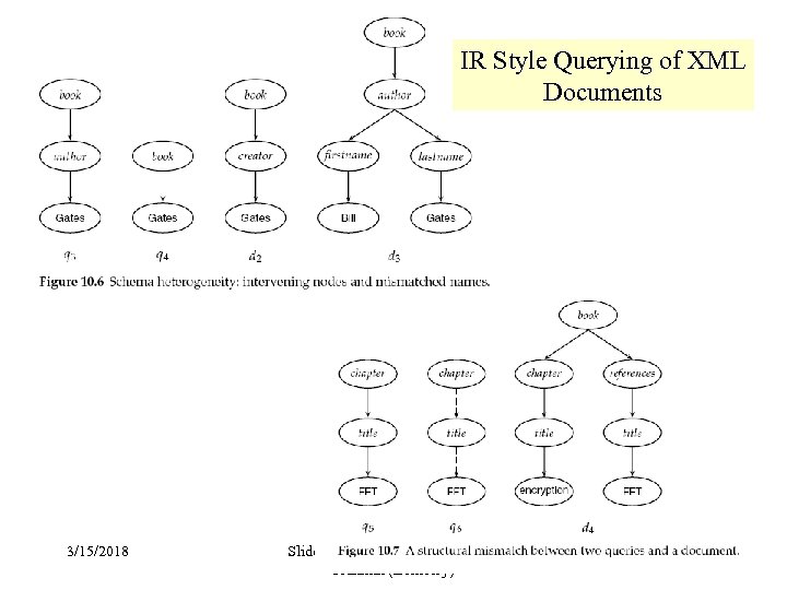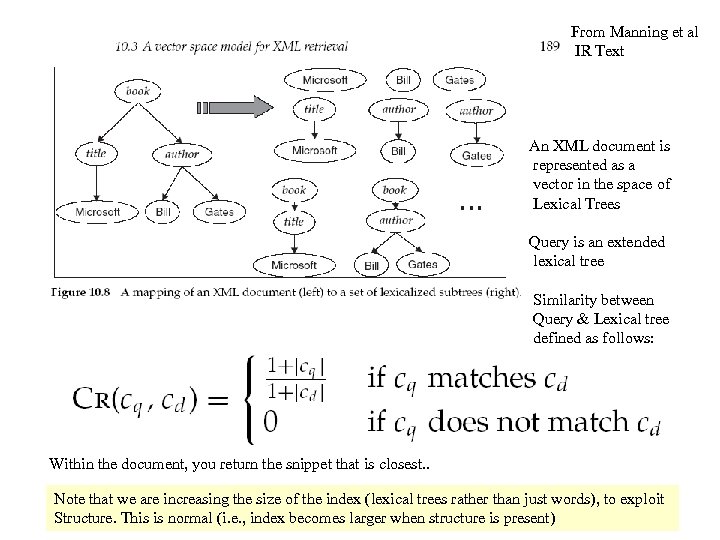 From Manning et al IR Text An XML document is represented as a vector in the space of Lexical Trees Query is an extended lexical tree Similarity between Query & Lexical tree defined as follows: Within the document, you return the snippet that is closest. . Note that we are increasing the size of adapted from Rao (ASU) & 3/15/2018 Slides the index (lexical trees rather than just words), to exploit 111 Structure. This is normal (i. e. , index becomes larger when structure is present) Franklin (Berkeley)