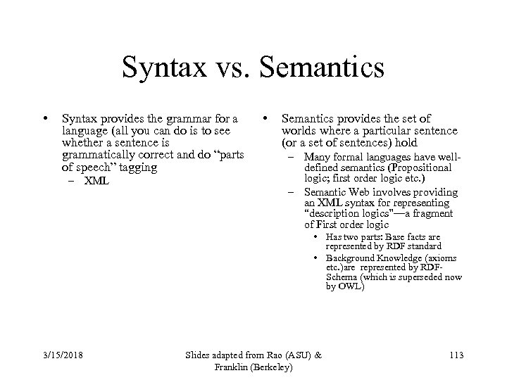 Syntax vs. Semantics • Syntax provides the grammar for a language (all you can do is to see whether a sentence is grammatically correct and do “parts of speech” tagging – XML • Semantics provides the set of worlds where a particular sentence (or a set of sentences) hold – Many formal languages have welldefined semantics (Propositional logic; first order logic etc. ) – Semantic Web involves providing an XML syntax for representing “description logics”—a fragment of First order logic • Has two parts: Base facts are represented by RDF standard • Background Knowledge (axioms etc. )are represented by RDFSchema (which is superseded now by OWL) 3/15/2018 Slides adapted from Rao (ASU) & Franklin (Berkeley) 113