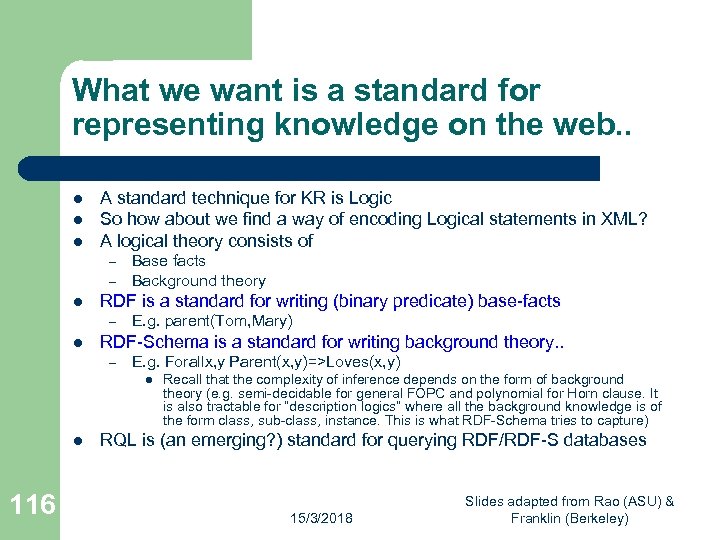 What we want is a standard for representing knowledge on the web. . l l l A standard technique for KR is Logic So how about we find a way of encoding Logical statements in XML? A logical theory consists of – – l RDF is a standard for writing (binary predicate) base-facts – l Base facts Background theory E. g. parent(Tom, Mary) RDF-Schema is a standard for writing background theory. . – E. g. Forallx, y Parent(x, y)=>Loves(x, y) l l 116 Recall that the complexity of inference depends on the form of background theory (e. g. semi-decidable for general FOPC and polynomial for Horn clause. It is also tractable for “description logics” where all the background knowledge is of the form class, sub-class, instance. This is what RDF-Schema tries to capture) RQL is (an emerging? ) standard for querying RDF/RDF-S databases 15/3/2018 Slides adapted from Rao (ASU) & Franklin (Berkeley)