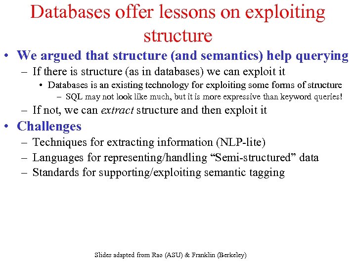 Databases offer lessons on exploiting structure • We argued that structure (and semantics) help querying – If there is structure (as in databases) we can exploit it • Databases is an existing technology for exploiting some forms of structure – SQL may not look like much, but it is more expressive than keyword queries! – If not, we can extract structure and then exploit it • Challenges – Techniques for extracting information (NLP-lite) – Languages for representing/handling “Semi-structured” data – Standards for supporting/exploiting semantic tagging Slides adapted from Rao (ASU) & Franklin (Berkeley)