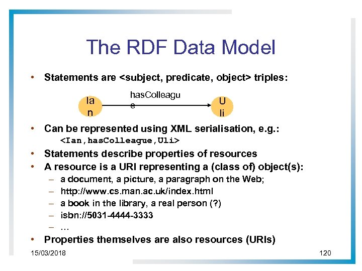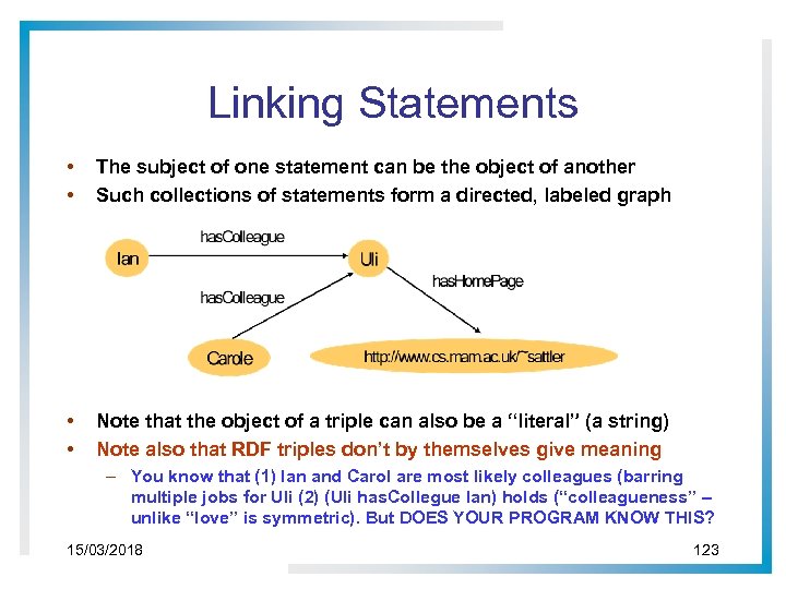 Linking Statements • • The subject of one statement can be the object of another Such collections of statements form a directed, labeled graph • • Note that the object of a triple can also be a “literal” (a string) Note also that RDF triples don’t by themselves give meaning – You know that (1) Ian and Carol are most likely colleagues (barring multiple jobs for Uli (2) (Uli has. Collegue Ian) holds (“colleagueness” – unlike “love” is symmetric). But DOES YOUR PROGRAM KNOW THIS? 15/03/2018 123