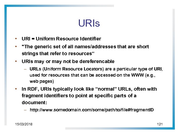 URIs • URI = Uniform Resource Identifier • "The generic set of all names/addresses that are short strings that refer to resources“ • URIs may or may not be dereferencable – URLs (Uniform Resource Locators) are a particular type of URI, used for resources that can be accessed on the WWW (e. g. , web pages) • In RDF, URIs typically look like “normal” URLs, often with fragment identifiers to point at specific parts of a document: – http: //www. somedomain. com/some/path/to/file#fragment. ID 15/03/2018 121