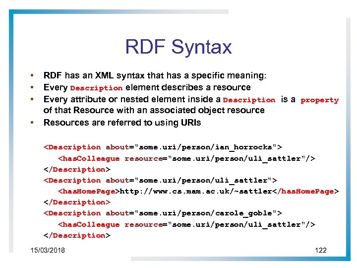 RDF Syntax • • RDF has an XML syntax that has a specific meaning: Every Description element describes a resource Every attribute or nested element inside a Description is a property of that Resource with an associated object resource Resources are referred to using URIs