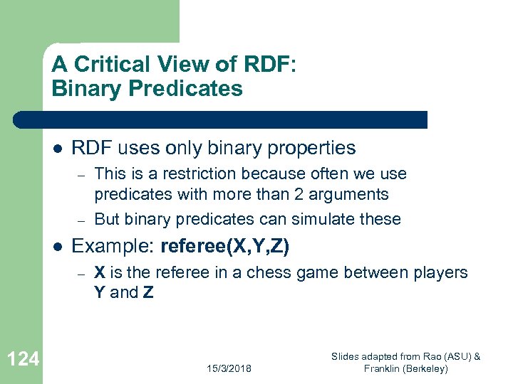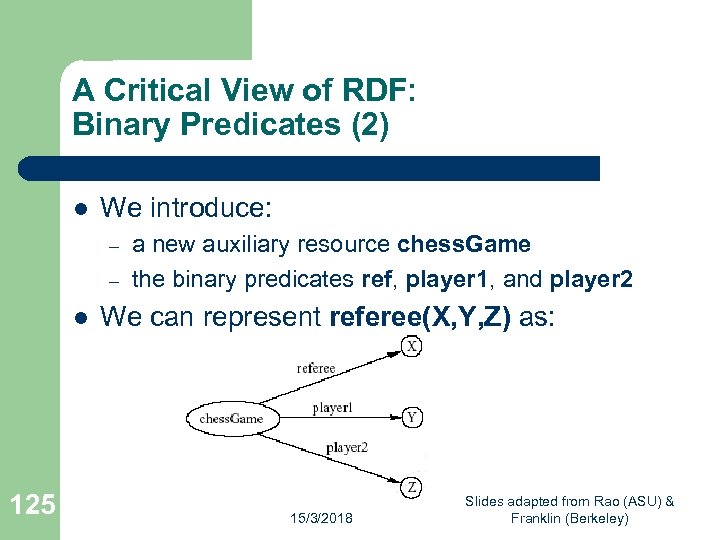 A Critical View of RDF: Binary Predicates l RDF uses only binary properties – – l Example: referee(X, Y, Z) – 124 This is a restriction because often we use predicates with more than 2 arguments But binary predicates can simulate these X is the referee in a chess game between players Y and Z 15/3/2018 Slides adapted from Rao (ASU) & Franklin (Berkeley)