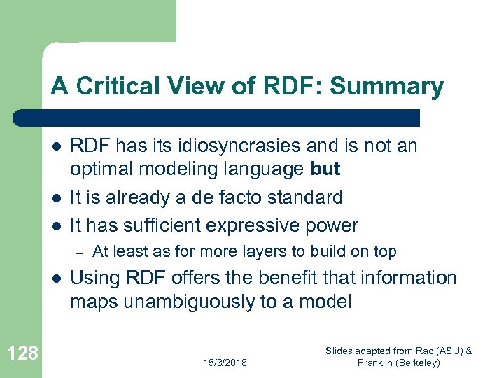 A Critical View of RDF: Reification l l 127 The reification mechanism is quite powerful It appears misplaced in a simple language like RDF Making statements about statements introduces a level of complexity that is not necessary for a basic layer of the Semantic Web Instead, it would have appeared more natural to include it in more powerful layers, which provide richer representational capabilities 15/3/2018 Slides adapted from Rao (ASU) & Franklin (Berkeley)
