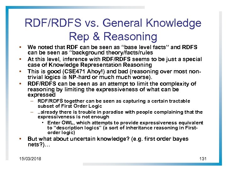 RDF/RDFS vs. General Knowledge Rep & Reasoning • • We noted that RDF can be seen as “base level facts” and RDFS can be seen as “background theory/facts/rules At this level, inference with RDF/RDFS seems to be just a special case of Knowledge Representation Reasoning This is good (CSE 471 Ahoy!) and bad (reasoning over most nontrivial logics is NP-hard or much worse). RDF/RDFS can be seen as an attempt to limit the complexity of reasoning by limiting the expressiveness of what can be expressed – RDF/RDFS together can be seen as capturing a certain tractable subset of First Order Logic –. . already there is trouble in paradise with people complaining that the expressiveness is not enough • Enter OWL, which attempts to provide expressiveness equivalent to “description logics” (a sort of inheritance reasoning in Firstorder logic) • But what about uncertain knowledge? (e. g. first order bayes nets? )… 15/03/2018 131