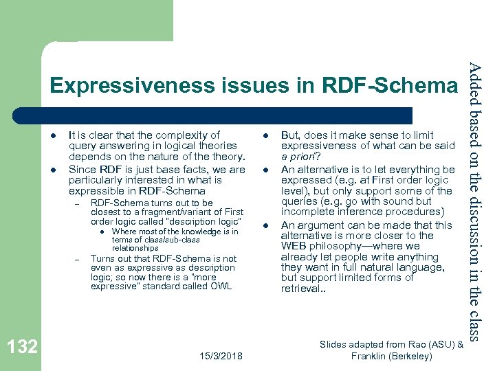 l l It is clear that the complexity of query answering in logical theories depends on the nature of theory. Since RDF is just base facts, we are particularly interested in what is expressible in RDF-Schema – RDF-Schema turns out to be closest to a fragment/variant of First order logic called “description logic” l – 132 Where most of the knowledge is in terms of class/sub-class relationships Turns out that RDF-Schema is not even as expressive as description logic; so now there is a “more expressive” standard called OWL 15/3/2018 l l l But, does it make sense to limit expressiveness of what can be said a priori? An alternative is to let everything be expressed (e. g. at First order logic level), but only support some of the queries (e. g. go with sound but incomplete inference procedures) An argument can be made that this alternative is more closer to the WEB philosophy—where we already let people write anything they want in full natural language, but support limited forms of retrieval. . Slides adapted from Rao (ASU) & Franklin (Berkeley) Added based on the discussion in the class Expressiveness issues in RDF-Schema