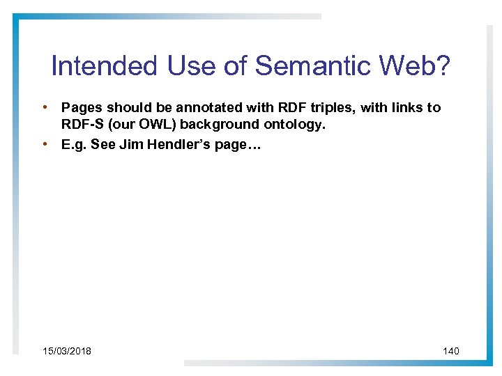 Intended Use of Semantic Web? • Pages should be annotated with RDF triples, with links to RDF-S (our OWL) background ontology. • E. g. See Jim Hendler’s page… 15/03/2018 140