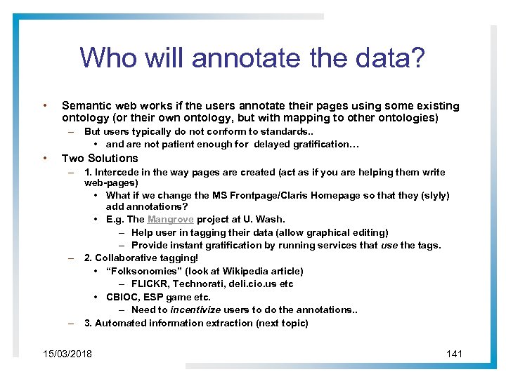 Who will annotate the data? • Semantic web works if the users annotate their pages using some existing ontology (or their own ontology, but with mapping to other ontologies) – But users typically do not conform to standards. . • and are not patient enough for delayed gratification… • Two Solutions – 1. Intercede in the way pages are created (act as if you are helping them write web-pages) • What if we change the MS Frontpage/Claris Homepage so that they (slyly) add annotations? • E. g. The Mangrove project at U. Wash. – Help user in tagging their data (allow graphical editing) – Provide instant gratification by running services that use the tags. – 2. Collaborative tagging! • “Folksonomies” (look at Wikipedia article) – FLICKR, Technorati, deli. cio. us etc • CBIOC, ESP game etc. – Need to incentivize users to do the annotations. . – 3. Automated information extraction (next topic) 15/03/2018 141