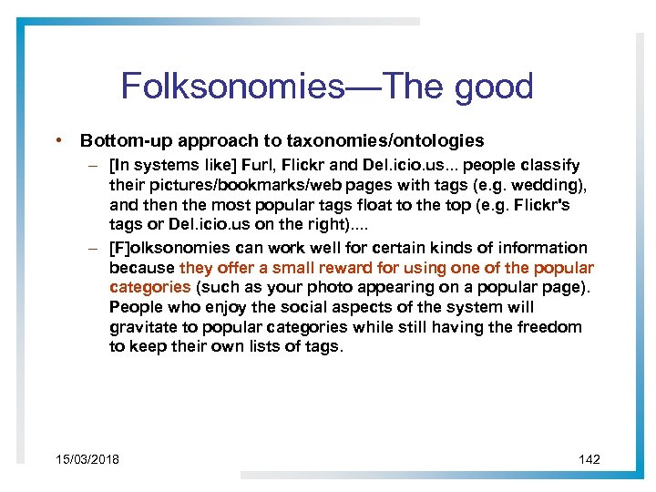 Folksonomies—The good • Bottom-up approach to taxonomies/ontologies – [In systems like] Furl, Flickr and Del. icio. us. . . people classify their pictures/bookmarks/web pages with tags (e. g. wedding), and then the most popular tags float to the top (e. g. Flickr's tags or Del. icio. us on the right). . – [F]olksonomies can work well for certain kinds of information because they offer a small reward for using one of the popular categories (such as your photo appearing on a popular page). People who enjoy the social aspects of the system will gravitate to popular categories while still having the freedom to keep their own lists of tags. 15/03/2018 142